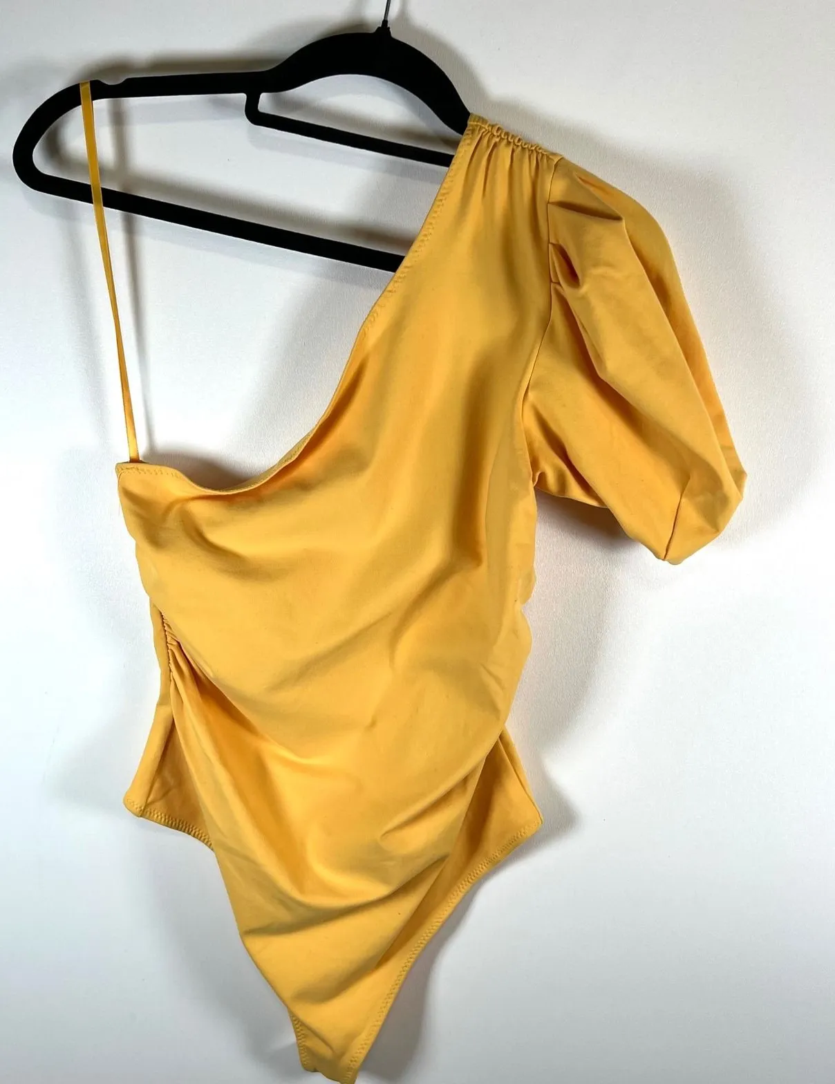Keywords: bodysuit, one shoulder, puff sleeve, ruched, yellow, summer, beachwear, resort wear, fashion, trendy, chic, designer, evening wear, night out