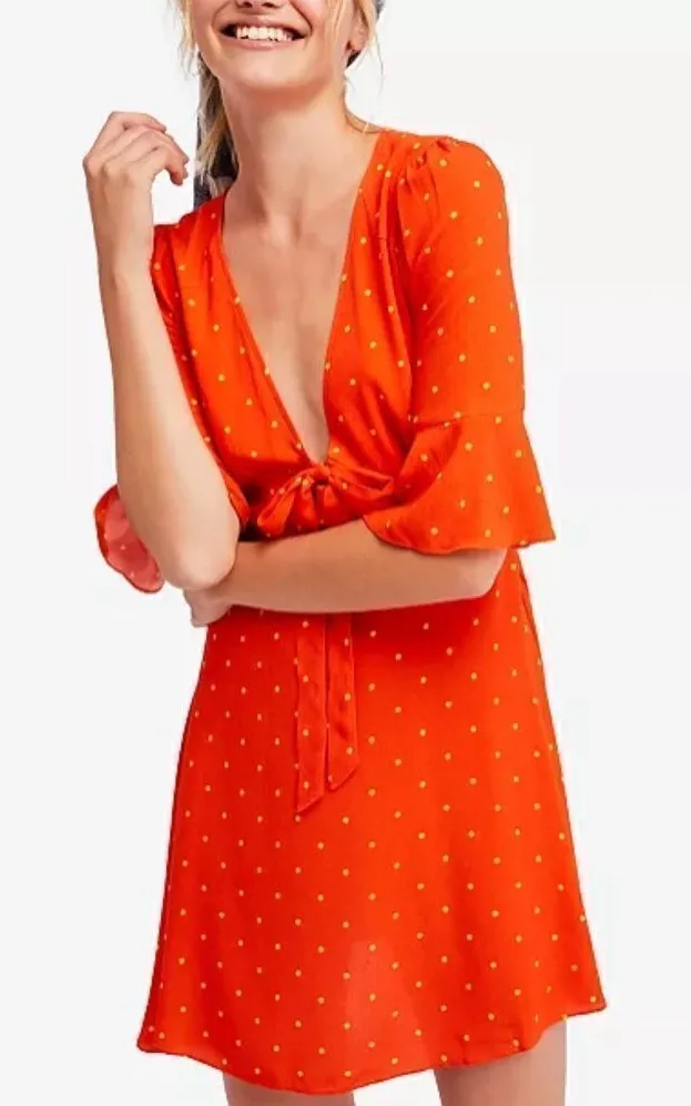 Free People All Yours Polkadot Flounce Sleeve Mini Dress Size 4 Orange with yellow polkadot print... Show more