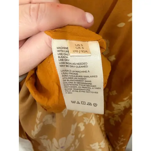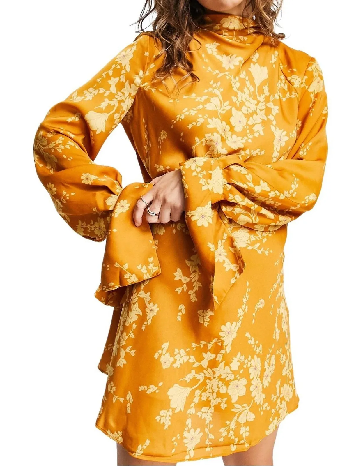 Free People Aries mini dress, floral print, mock neckline with back buttons, long bell sleeves, open... Show more
