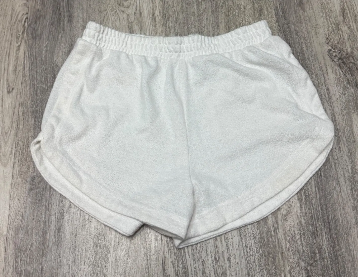 Women's white terry cloth dolphin shorts. These shorts feature an elastic waistband for a comfortabl... Show more