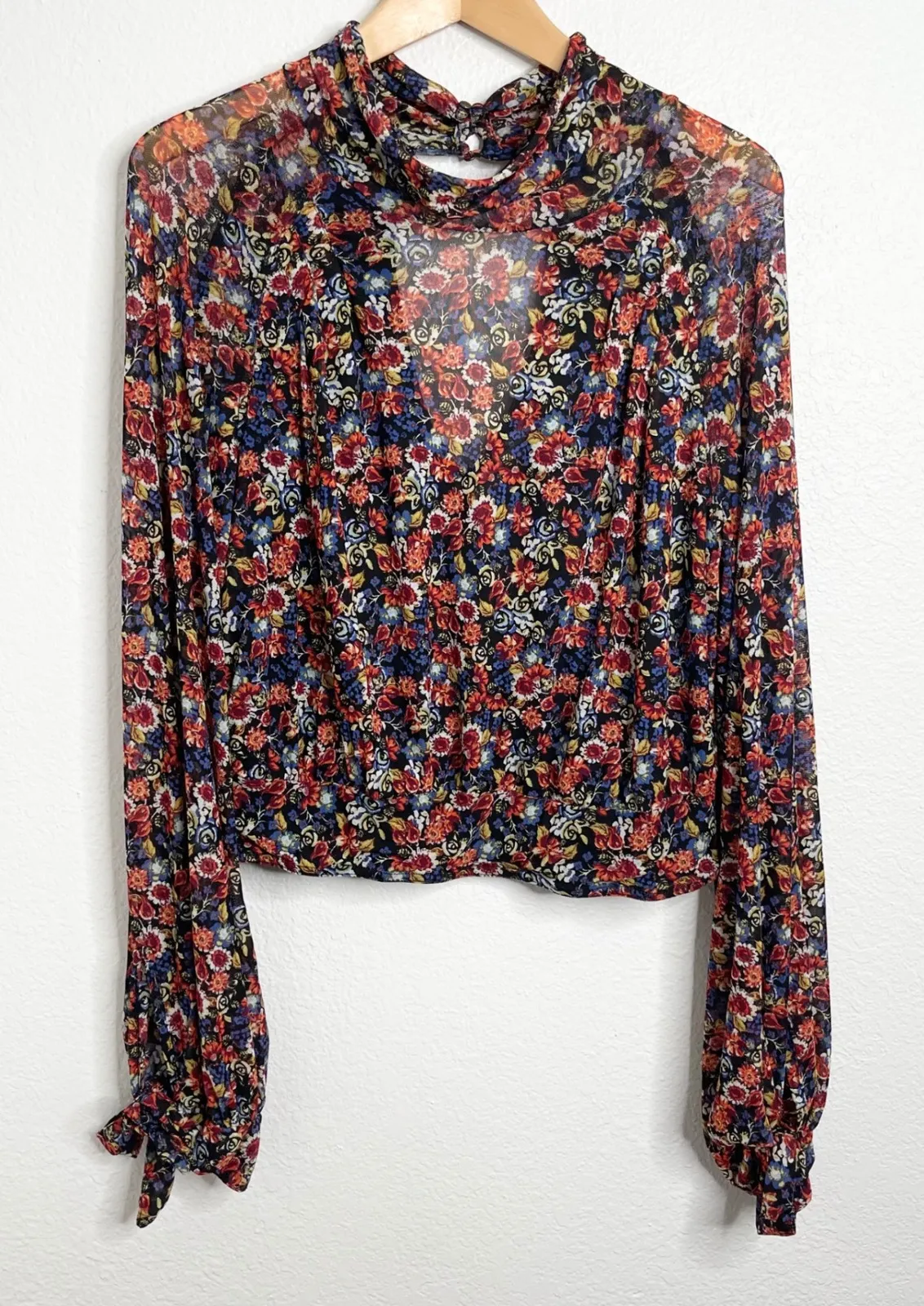 A sheer floral mock neck cropped blouse. This playful top features a keyhole cutout at the back and... Show more