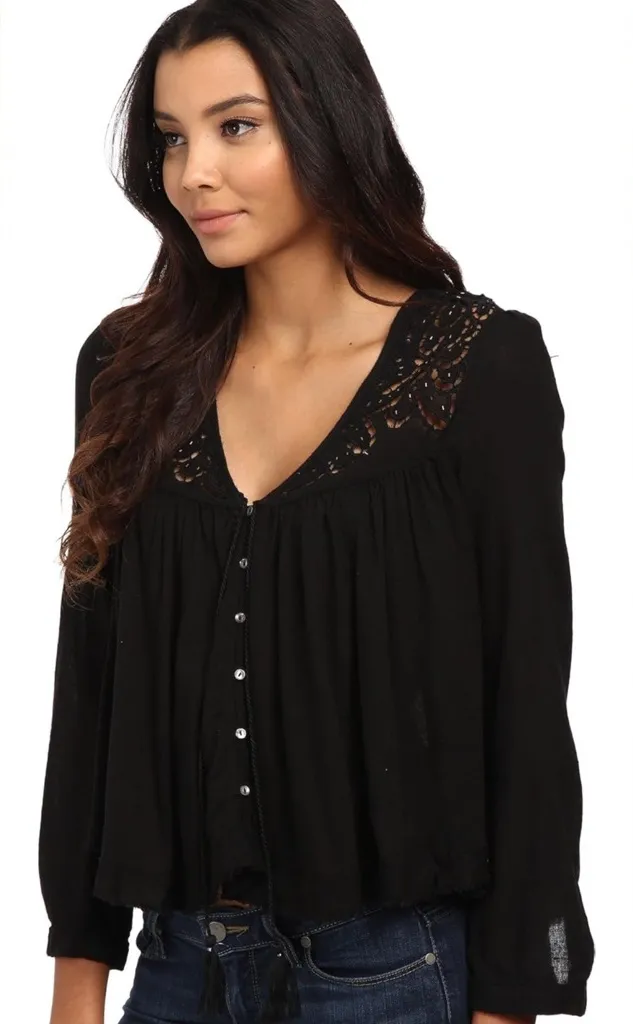 This black boho-inspired blouse features a beautifully detailed cutout lace design along the necklin... Show more