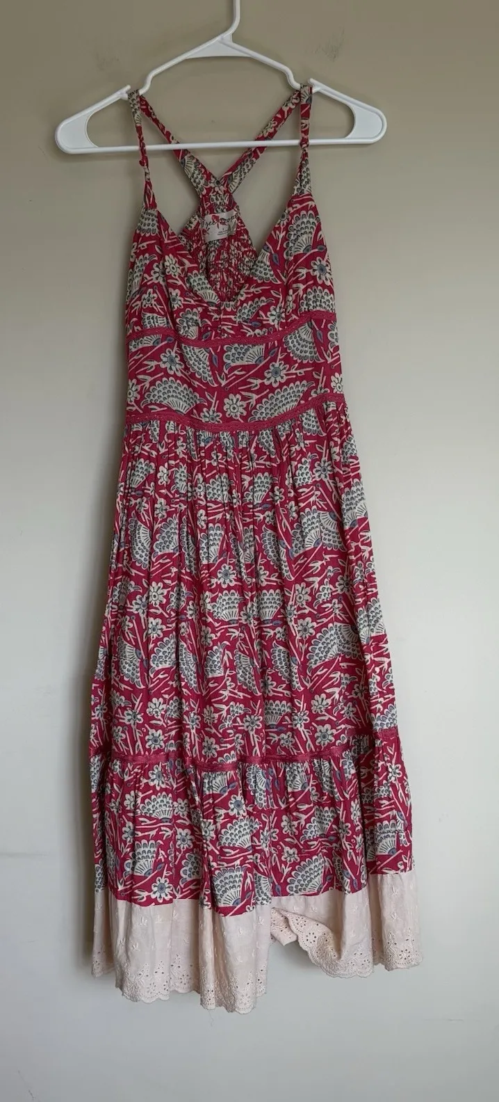 The Free People Boho Eyelet Trim Peacock Feather Print Midi Dress in size 2 is a stylish and lightwe... Show more