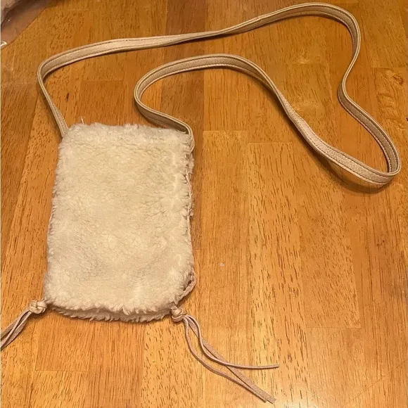 . It’s made of faux fleece, a cotton lining, a snap closure and calf leather crossbody strap. The cr... Show more