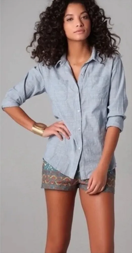 Crochet back Light denim chambray Great pre owned condition Approximate measurements Bust across... Show more
