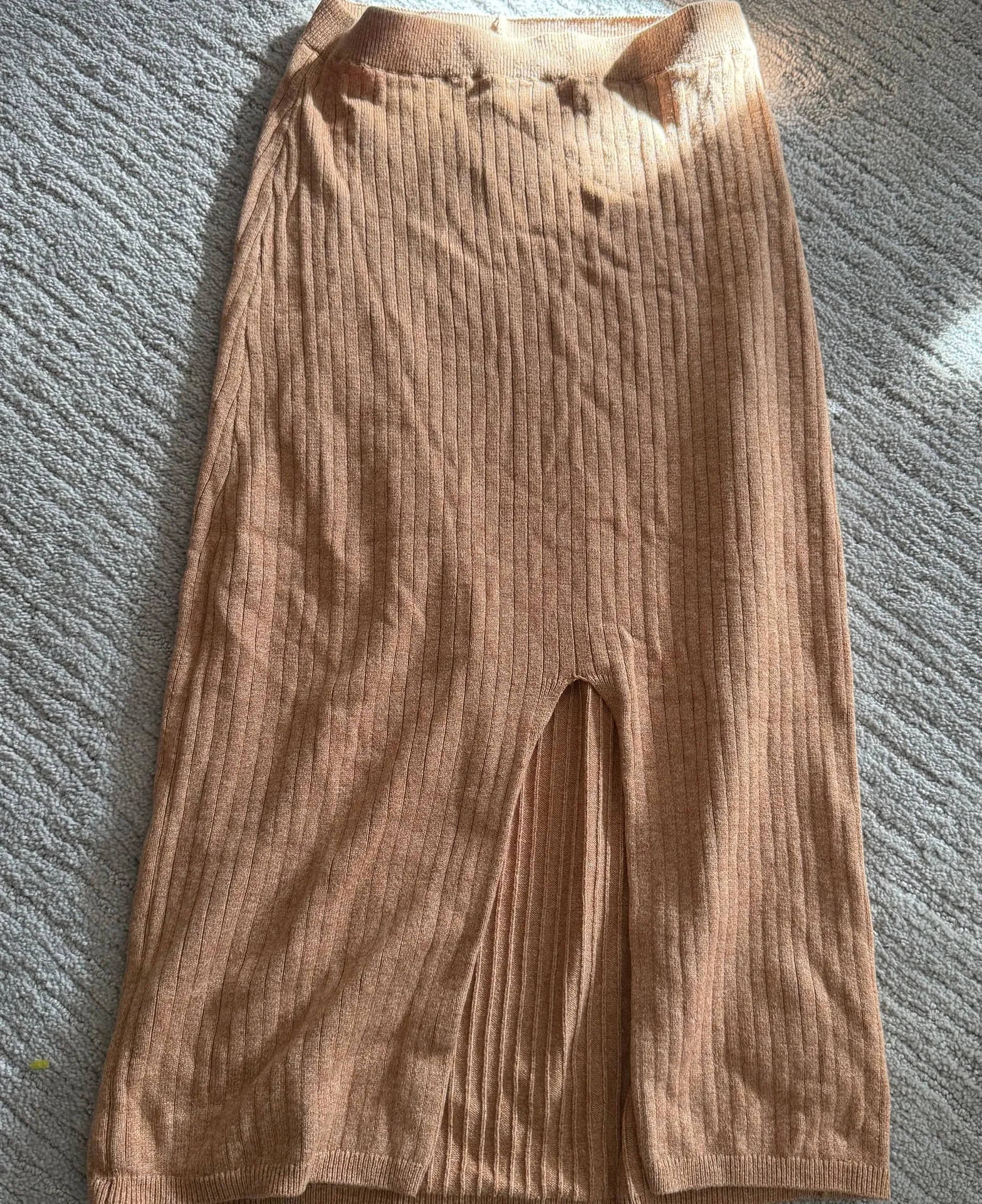 Free People tan ribbed midi skirt, featuring a comfortable elastic waistband and a stylish front sli... Show more