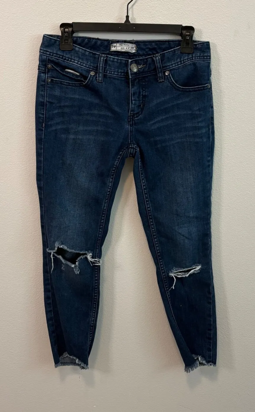 Keywords: Free People, jeans, skinny jeans, distressed jeans, ripped jeans, dark wash, denim, ankle jeans, women's jeans, size 27, frayed hem, casual jeans, stylish jeans
