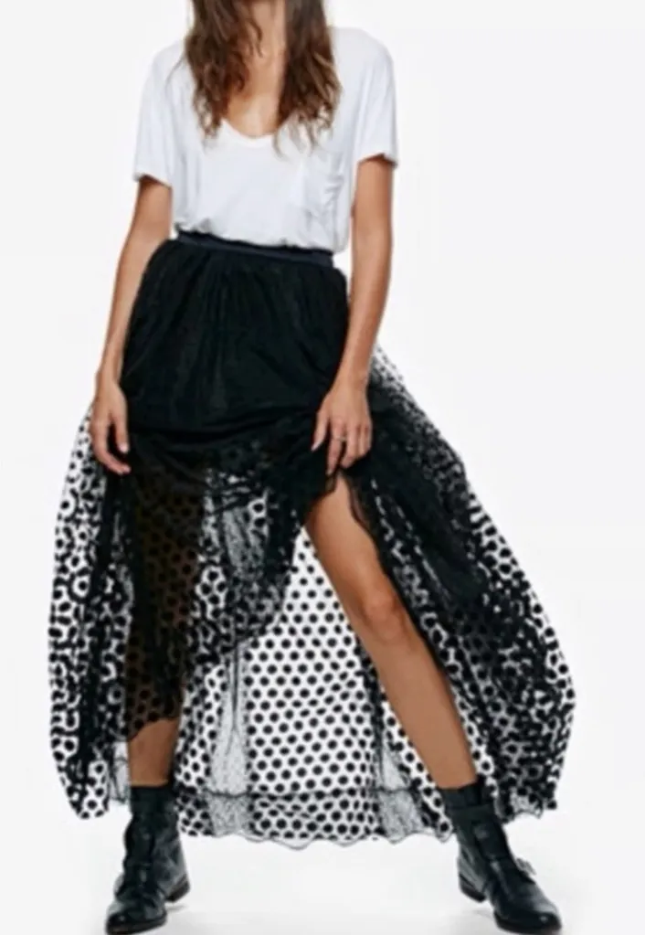 Beautiful maxi skirt with a mini liner . This black mesh polka dot skirt brings a perfect blend of p... Show more