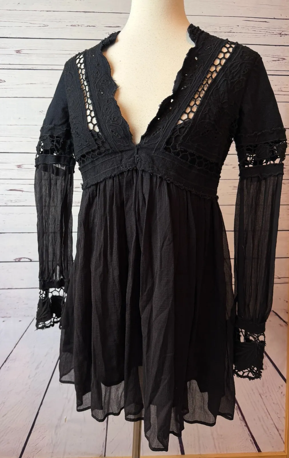 Free people Dress Boho Black LBD in color size 2 Tunic Whimsygoth Sexy Cut Out Deep VNeck with Flare... Show more