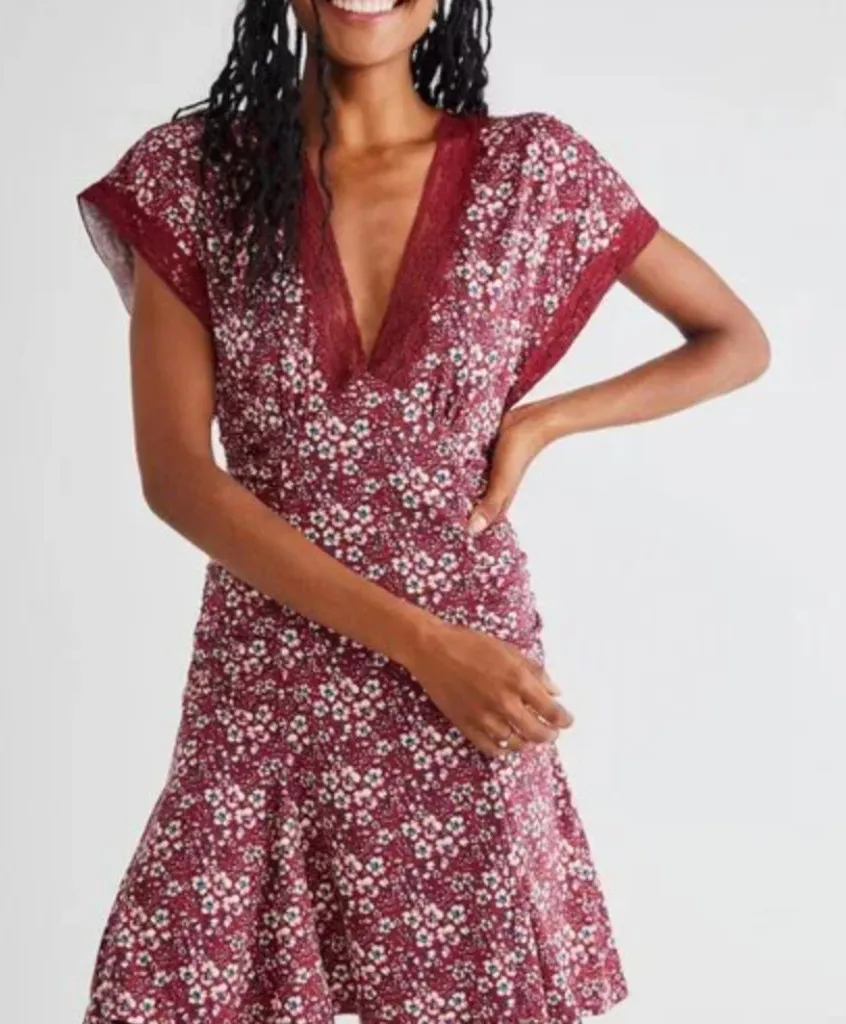Free People Floral Lace Dress in the color Red. V neckline with lace detailing, short cap sleeves, r... Show more