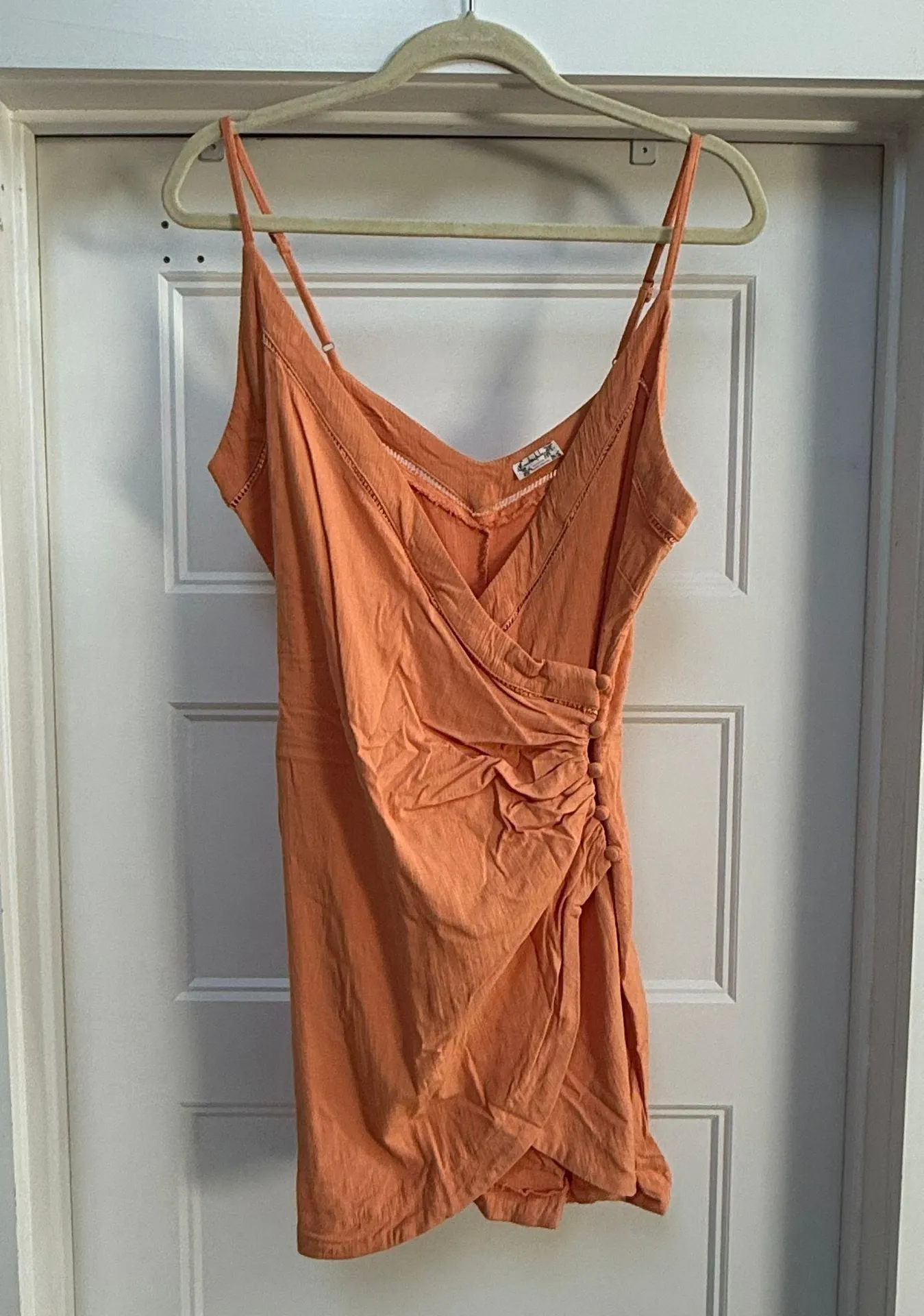 Sherbert colored bodycon dress with slit, crochet and button details Adjustable straps Original ow... Show more
