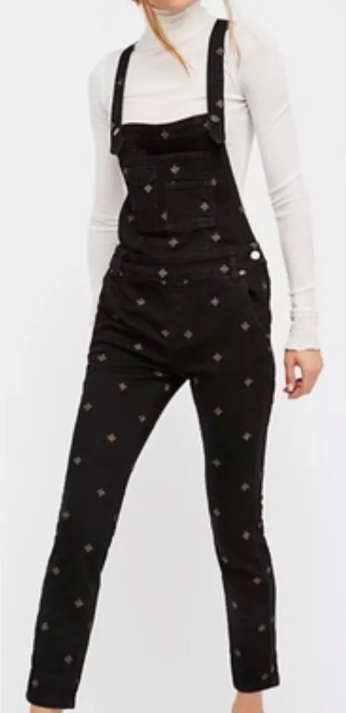Free People Embroidered Star Skinny Overalls in Washed Black Gold Size 25 Excellent Used Conditio... Show more