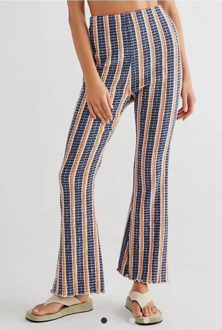 Free People flare pants in a vibrant striped pattern. These boho pants feature a comfortable crochet... Show more