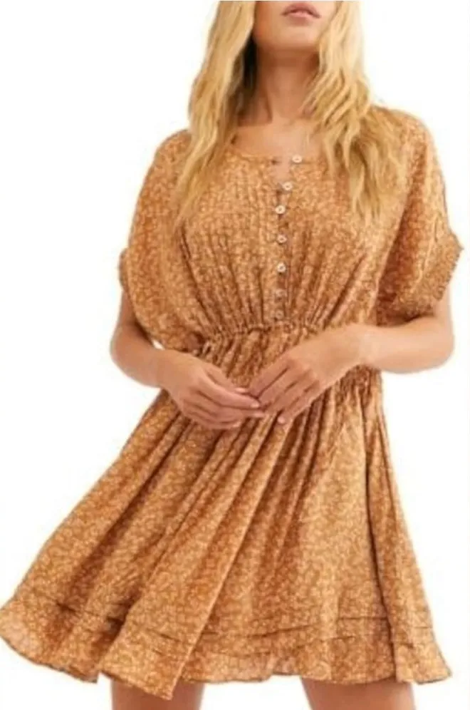 Stylish floral dress in a warm brown shade. Features a tie detail.