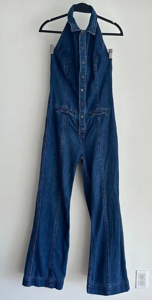 Free People Denim Jumpsuit 8 Blue Flared Halter One Piece Low Back 70s Retro Amazing iconic denim j... Show more