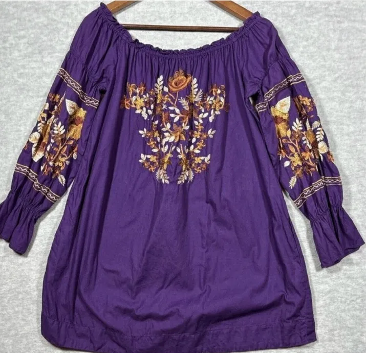Free People women's off-shoulder dress in size M, featuring a boho Fleur Du Jour embroidery in an ey... Show more