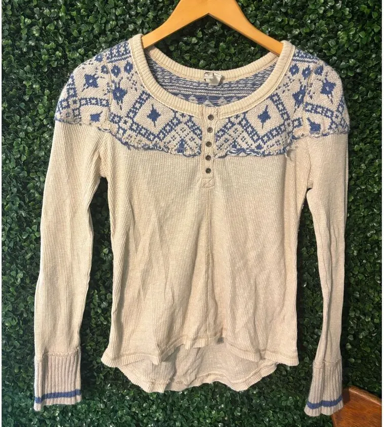 Free People Women Cabin in the Woods Blue Fair Isle Cream Henley Top Medium -Great Condition -Fitte... Show more