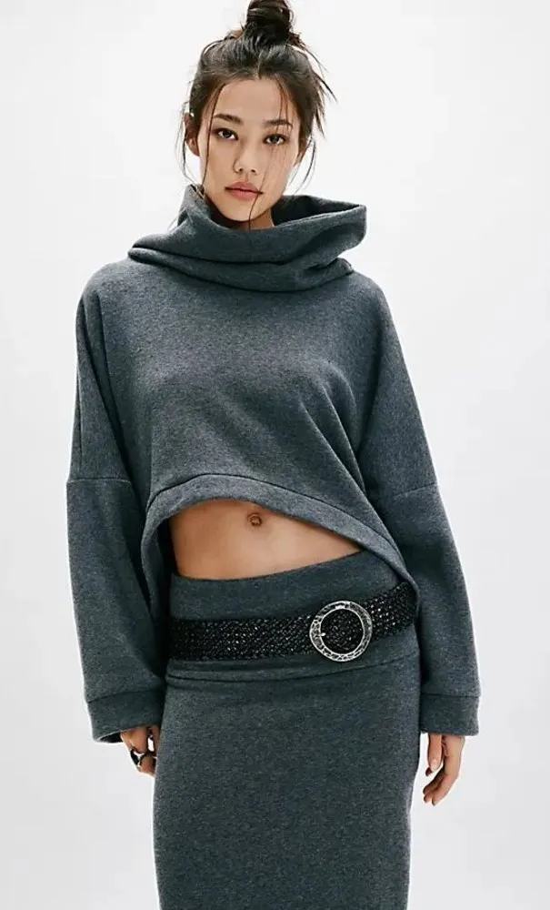 Fit: Top: Oversized turtleneck silhouette; Skirt: Mid-rise, true column silhouette Features: Top: Co... Show more