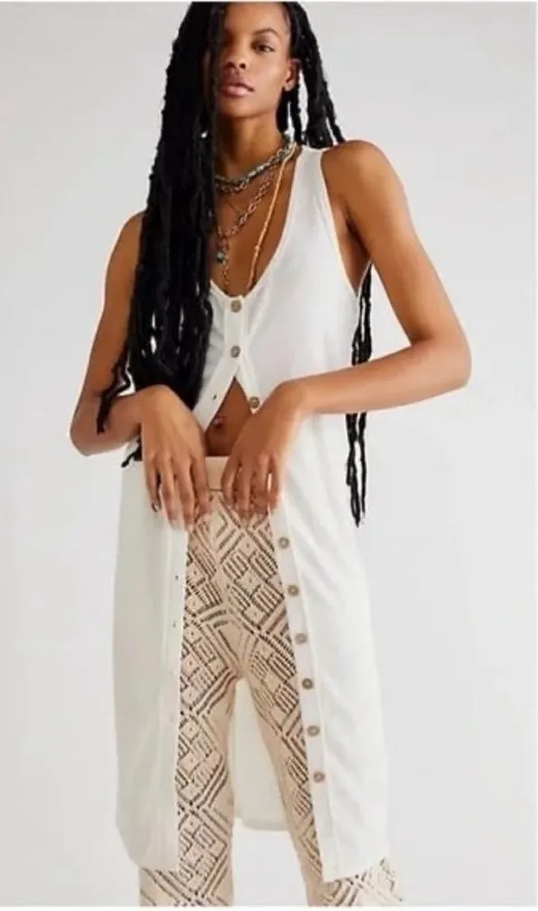 Free People Gia Long Vest / Dress from the We The Free collection in a versatile cream color. This piece can be worn open as a long vest or buttoned up as a dress.