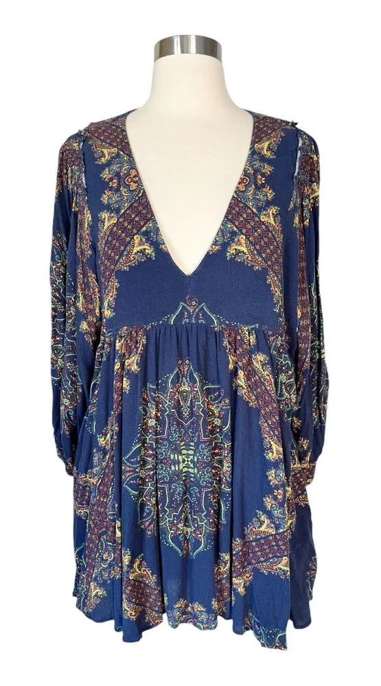 FREE PEOPLE Girl Talk Hi-Low Tunic Dress Midnight Medium EUC Flowy and Relaxed Fit V-Neck 3/4 Ba... Show more