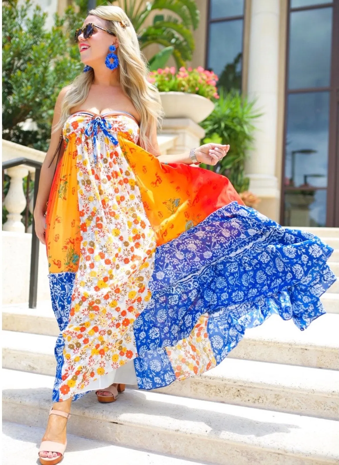 Features a vibrant patchwork of assorted colors and prints, including floral and crochet lace sections, giving it a bohemian (boho) look. It has a flowy, floor-sweeping silhouette.