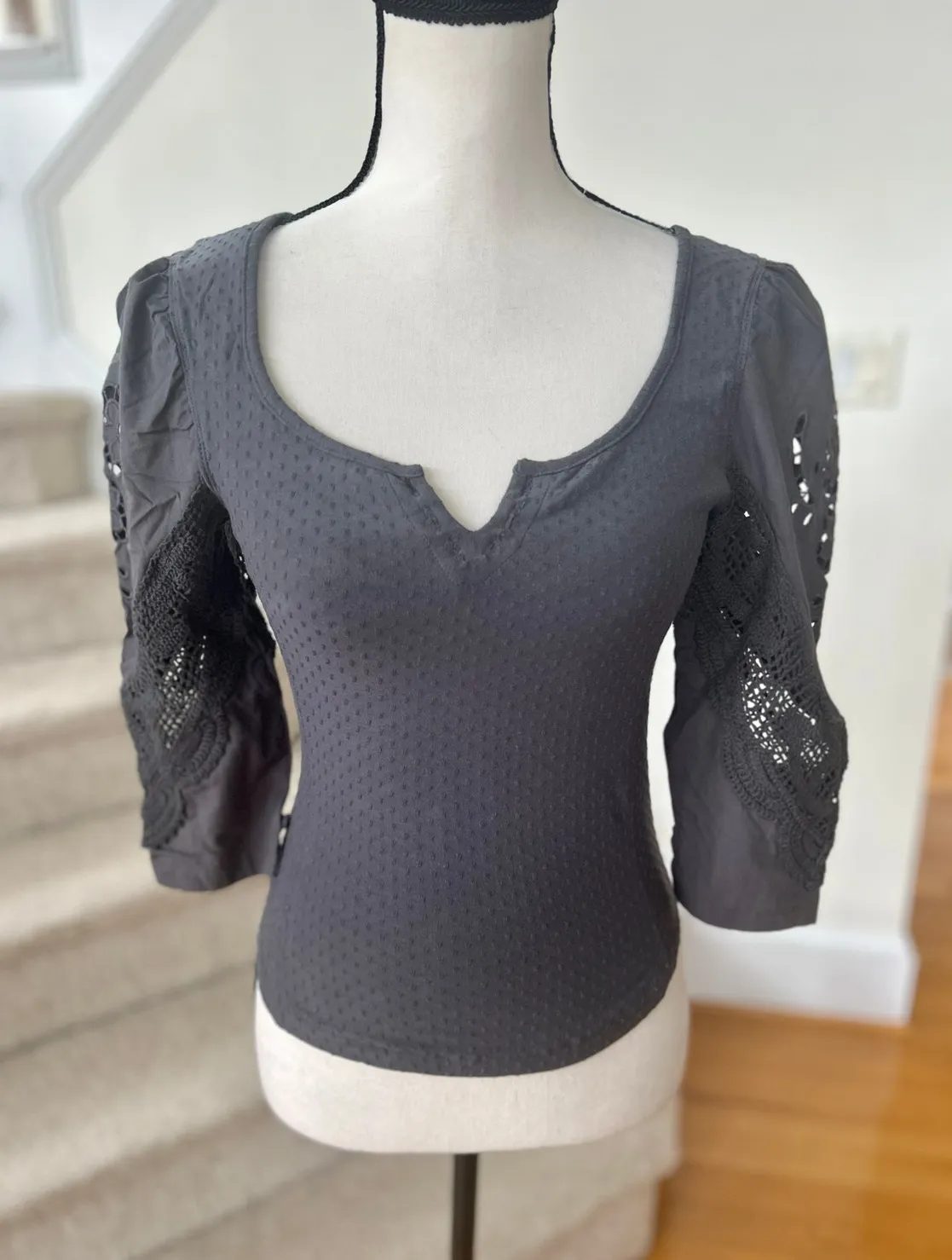 Excellent condition. Dark grey, stretchy body, with lace and crochet floral sleeves. Scoop neck. Si... Show more