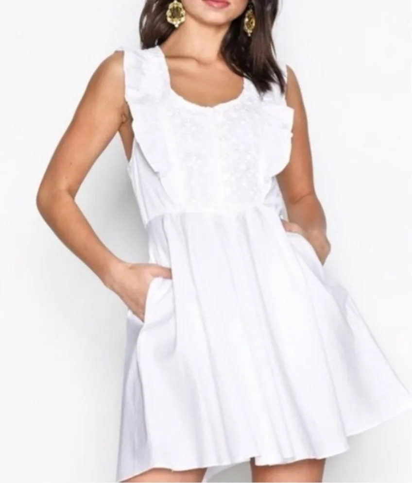 Free People boho white “half moon” dress. Mini length. Fitted bodice with ruffles, lace inset and bu... Show more
