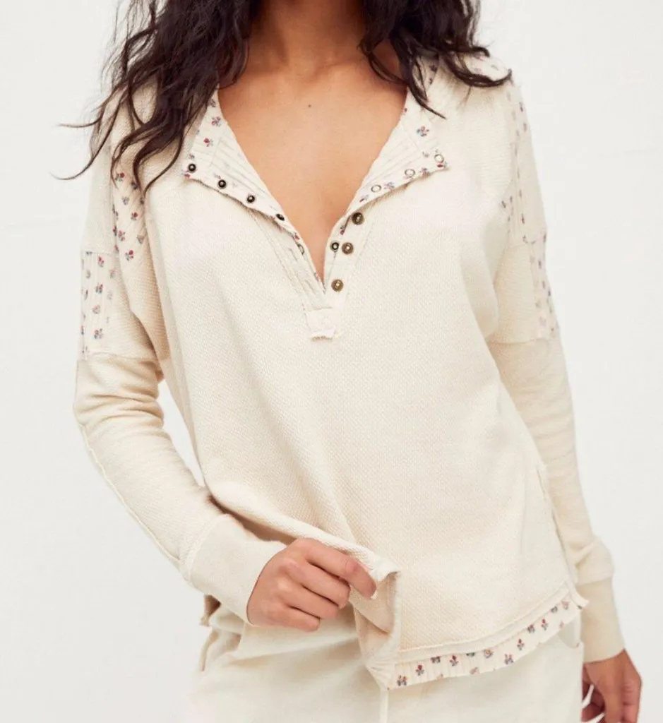 Free People Heart-to-Heart Henley Top in the color Cream. Featuring patchwork design (with floral pr... Show more