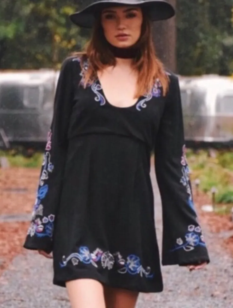 Elaborate embroidery lends an eclectic feel to this slim Free People dress, styled with a deep scoop... Show more