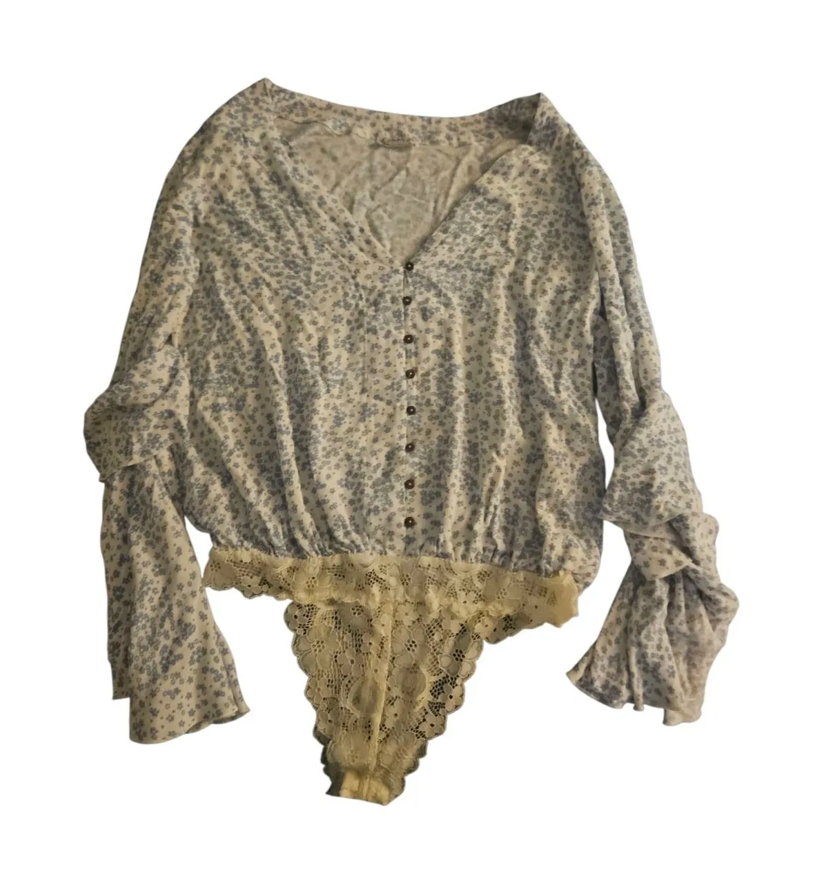 Keywords: Free People bodysuit, floral print bodysuit, lace trim bodysuit, bell sleeve bodysuit, bohemian bodysuit, romantic bodysuit, women's bodysuit, long sleeve bodysuit, V neck bodysuit, casual bodysuit, going out bodysuit, lounge wear, designer bodysuit
