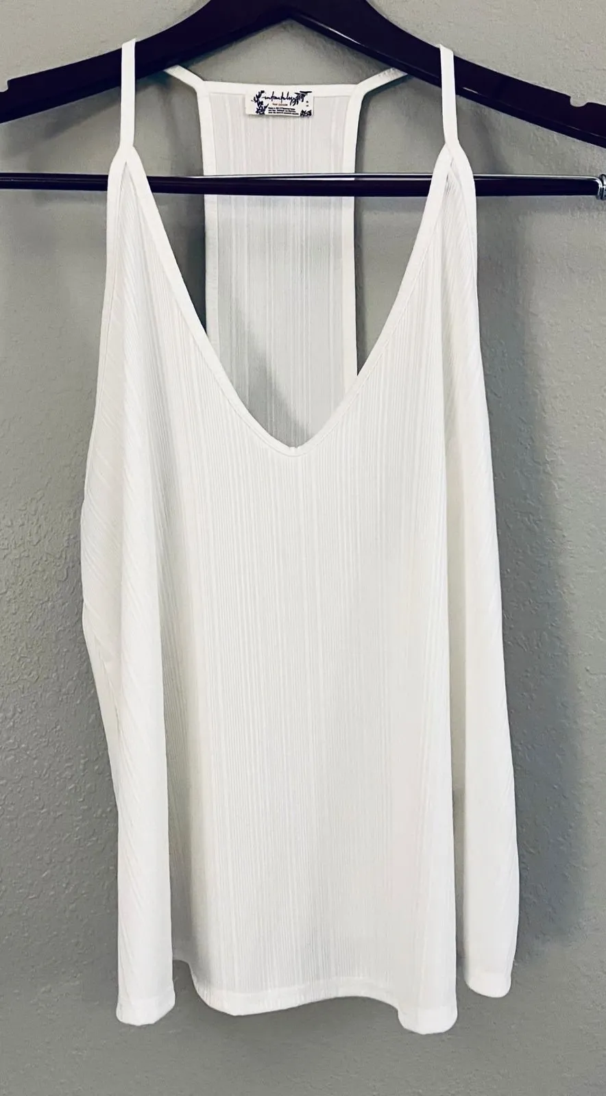 A white ribbed racerback cami tank top with a deep V neckline. This versatile tank top offers a flattering silhouette with its subtle ribbing and delicate spaghetti straps, making it a perfect layering piece or standalone top. Its relaxed fit ensures comfort and ease of movement. Ideal for casual outings, lounging at home, or as a chic base layer under blazers or cardigans. Keywords: Free People Cami, Intimately Free People, White Tank Top, Ribbed Tank, Racerback Tank, V Neck Cami, Spaghetti Strap Tank, Layering Tank, Basic Tank, Casual Top, Summer Top, Loungewear, Boho Chic, Women's Fashion