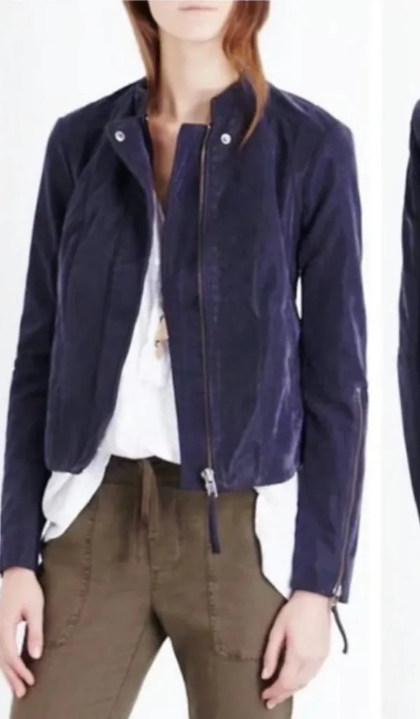 Free People Vegan Suede Jacket in the color Navy Blue. Collared, full zip with single snap button cl... Show more