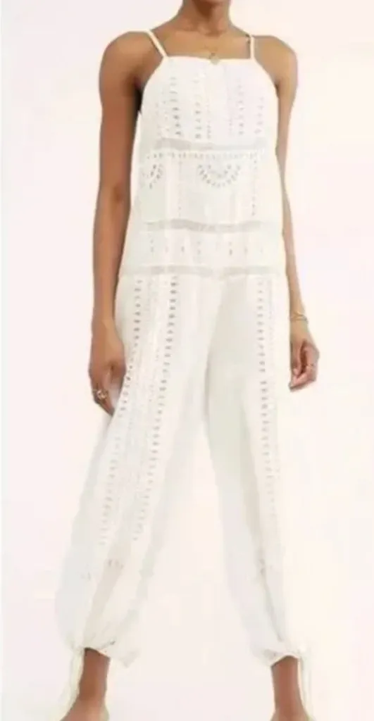 Free People Savannah Eyelet Jumpsuit in the color White. Straight neckline, tie back spaghetti strap... Show more