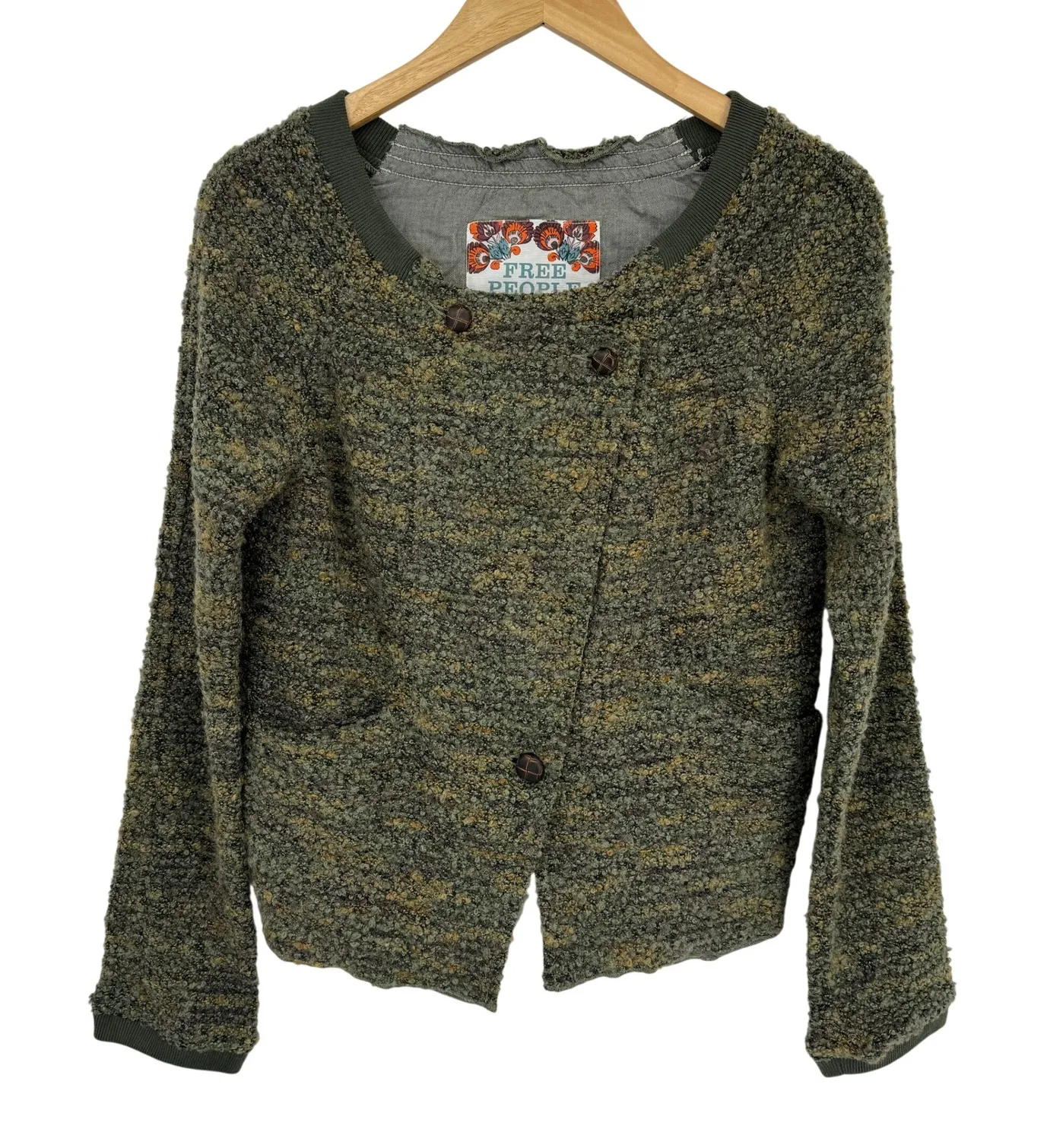 Wrap yourself in cozy texture with this Free People cardigan. The unique boucle knit in a rich oliv... Show more