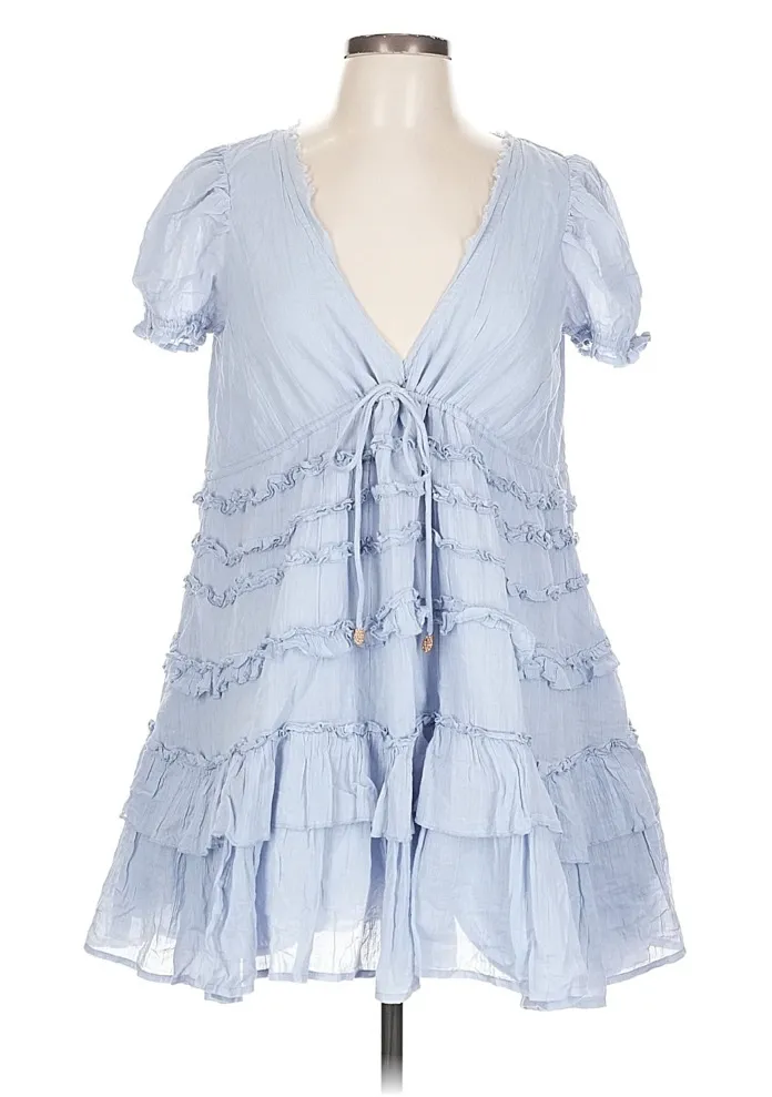 Tiered ruffled light blue loose flowy tunic top / mini babydoll dress. Featu... Show more