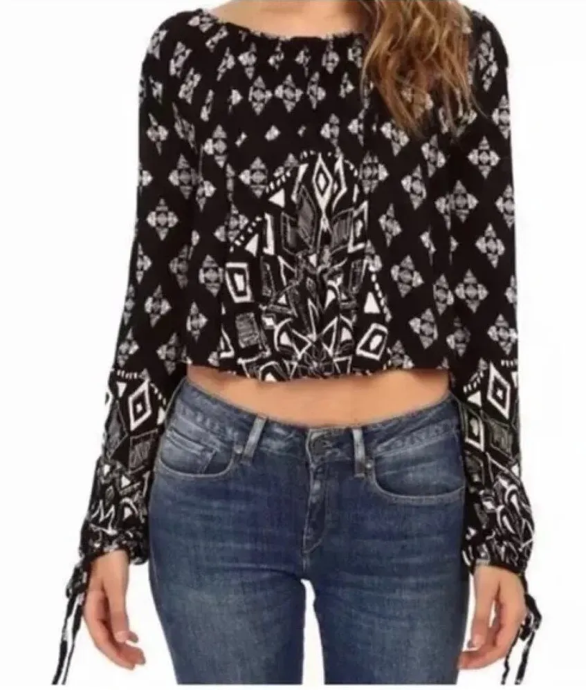 Free People Linen Blend Dazed Swing Crop Top in Black & White Geo Print, Size Large Features: round... Show more