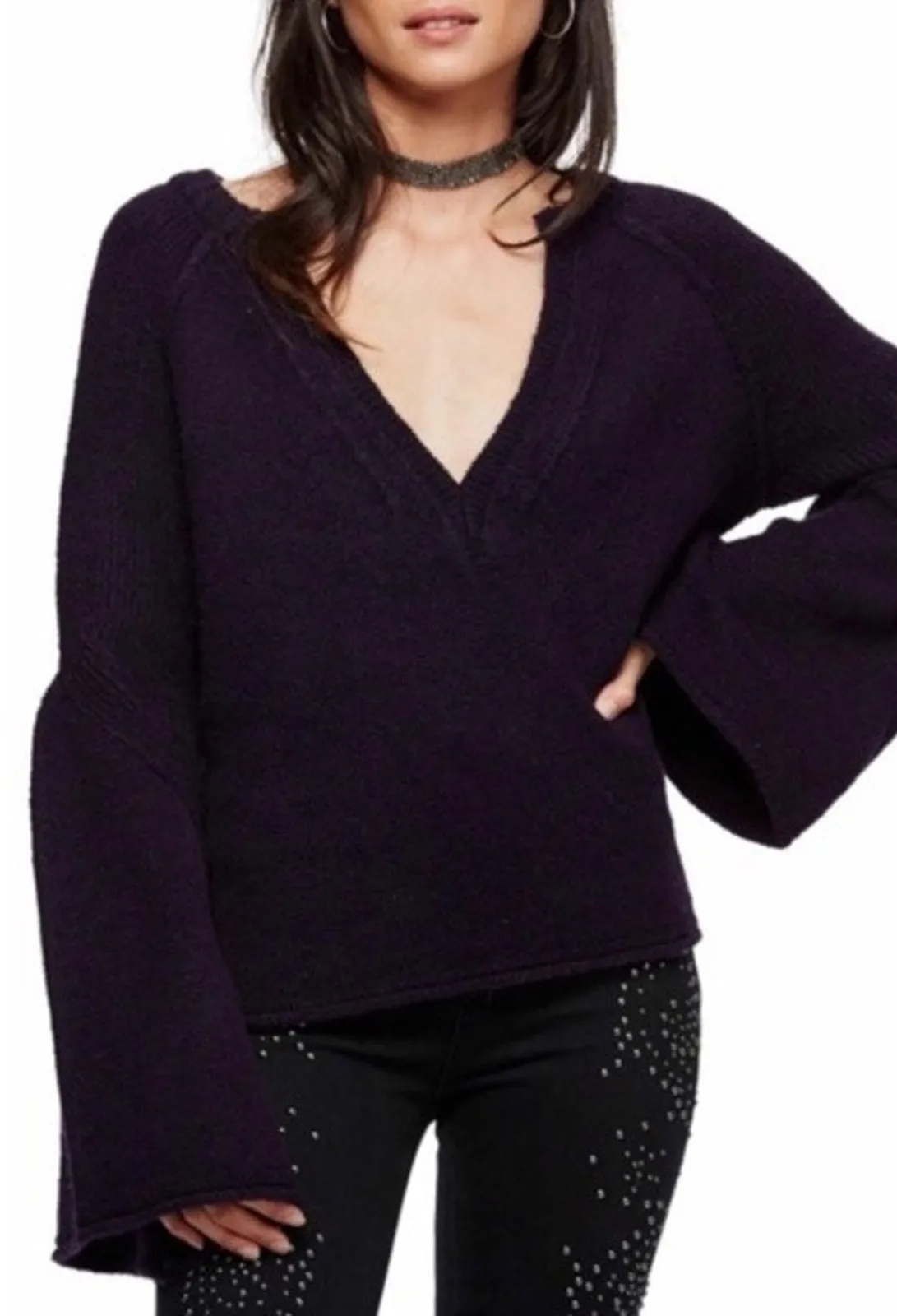 A cozy, elevated essential with that signature FP flair. This deep plum knit features a dramatic V-neckline and wide flowy sleeves that add instant movement and shape. Soft, warm, and beautifully designed, it pairs perfectly with denim, trousers, or skirts for polished everyday style. A luxe statement piece that feels as good as it looks.