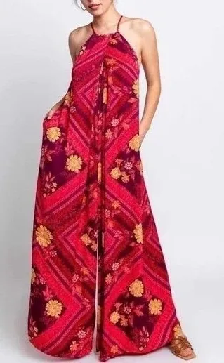 Free People halter maxi dress in a vibrant red floral print. This flowing dress features delicate sp... Show more