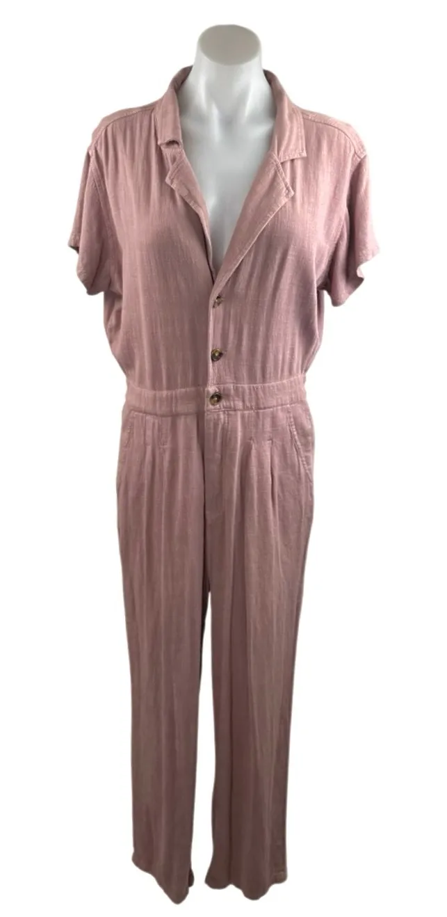 Free People Margot Pink Linen Short Sleeve Button Front Straight Leg Romper Jumpsuit M Size: M Cond... Show more