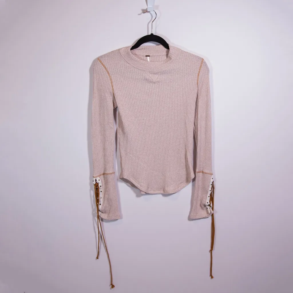Free People Moutaineer Waffle Knit Lace Up Long Sleeve Crew Neck Tee Shirt Beige Raw edge waffle kn... Show more