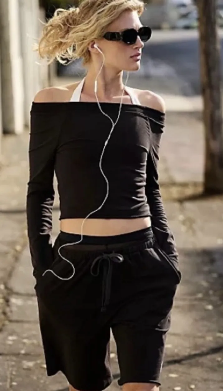 Effortlessly elevate your workout wardrobe rotation with this super cool set featuring an off-the-shoulder long-sleeve top with coordinating longline shorts for the perfect done-in-one look no matter the activity. **Fit:** Fitted top; slightly relaxed shorts **Features:** Top: Defined boat neckline; long-sleeve silhouette; fitted style; cropped silhouette Shorts: High-rise style; drawstring-adorned waist; side pockets; longline silhouette; raw bottom hem; small zip pocket at back Brand Free People NWOT Black Small Pit to Pit 12” Inseam 8” NWOT