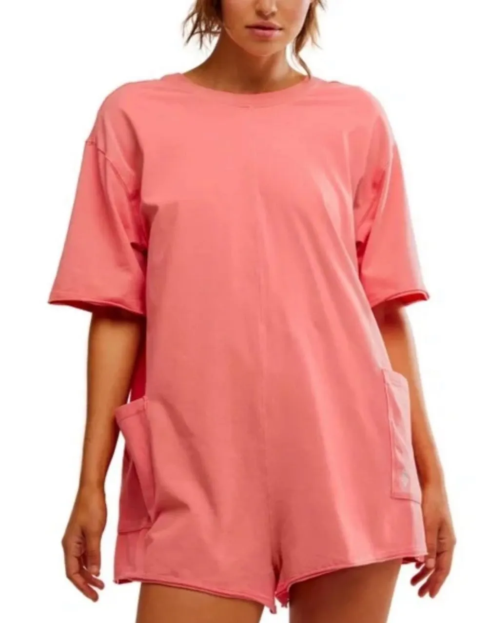 A new addition to our fan-favorite Hot Shot collection, this soft romper is featured in an oversized fit and shapeless silhouette with pockets at the front and V-shaped back detail. Fit: Shapeless, oversized fit; shorty-length Features: Soft fabrication with a stretchy feel, scoop neckline, ribbed trim, patch pocket detail at front, V-shaped back, dropped sleeves, raw hemlines . Why We ❤ It: Ultra-comfy and seriously soft, this one-piece is sure to become your new favorite post-workout essential. Measurements for size Small Inseam: 2 in Hips: 51 in Waist: 44 in Bust: 44 in Rise: 27 in