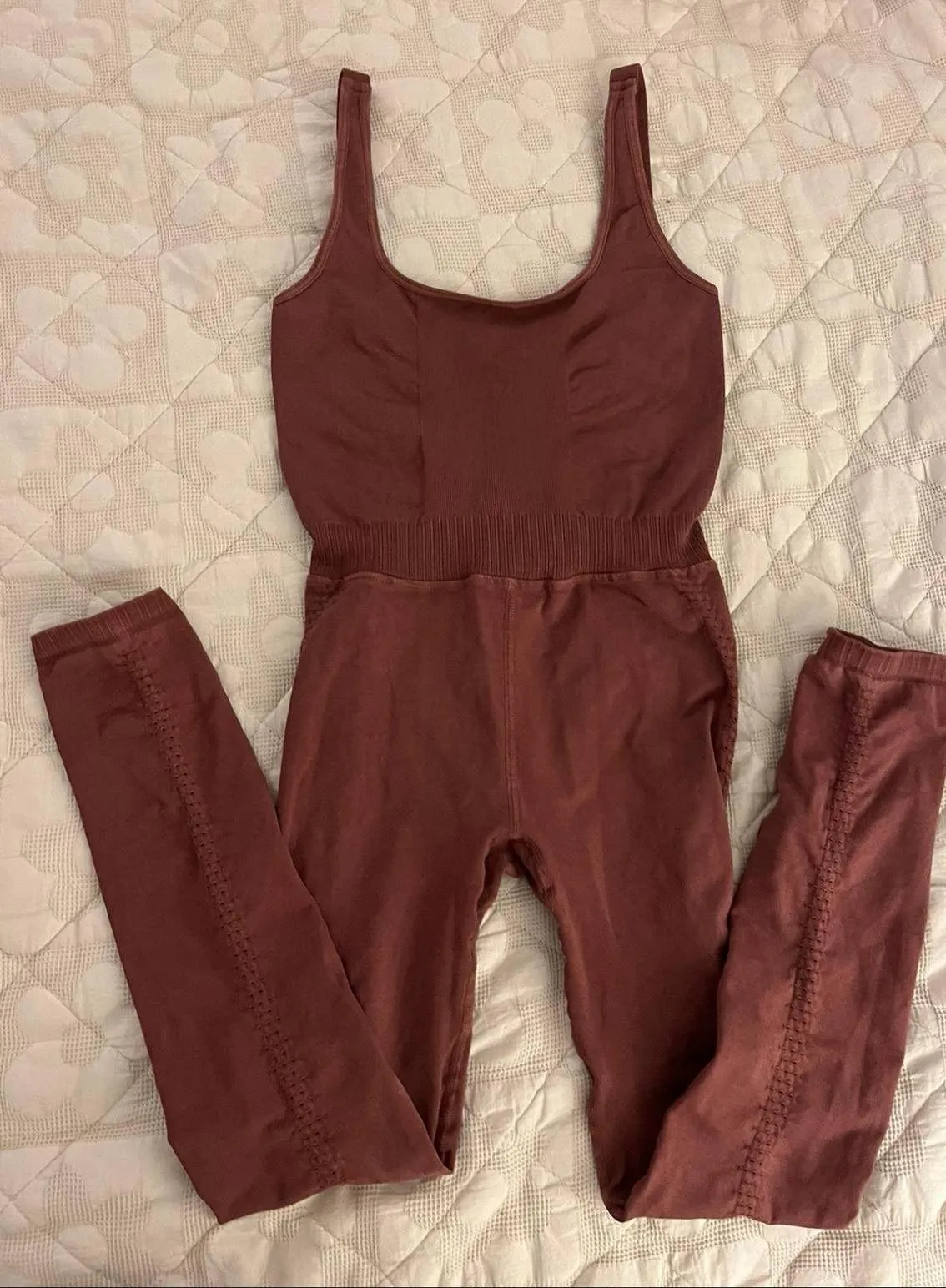 Brown free people movement jumpsuit, only been worn a few times. The actual color is better represented in the last 2 pictures. Size xs/s tp/p on the tag (pictured) I’m usually a size xs in free people and it fits me. The straps have some wear on them but it seems to be the way they were made (also pictured) the texture on the sides of the legs are little holes that are see through. really comfy and cute, just not the right color on my skin tone!