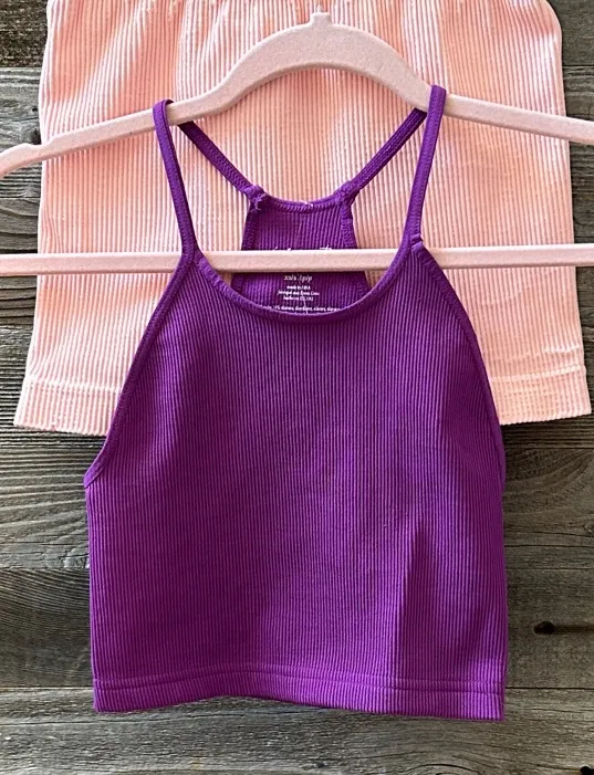 This free people movement set includes a ribbed purple new with tag sports bra, and new without tags, pink ribbed biker shorts. Both are in new condition, with no flaws. The size is extra small/small. The inseam on the shorts is approximately 4 inches, and the rise is approximately 9 1/2 inches.