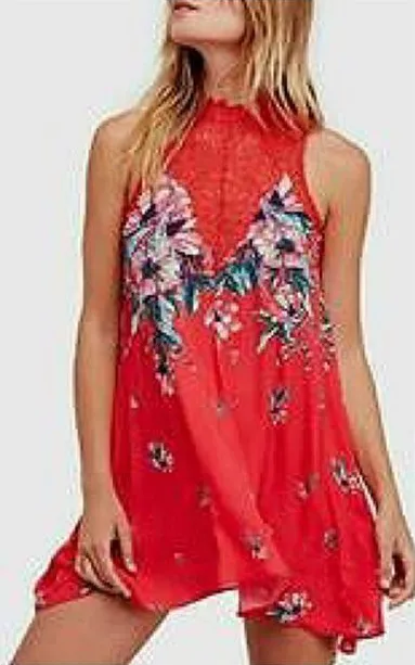 New. Free People red dress with lace detail at high neck. Beautiful floral print. Asymmetrical hem l... Show more