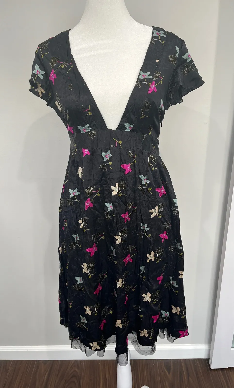 Free People Night and Day midi dress crafted from luxurious 100% silk featuring a vibrant pink and sage green floral motif over a midnight black base. This archival gem from around 2006-2008 boasts a flattering empire waist, delicate flutter sleeves, and a deep V-neckline. The skirt is finished with a signature tiered black mesh/tulle trim that peeks out from the hem.