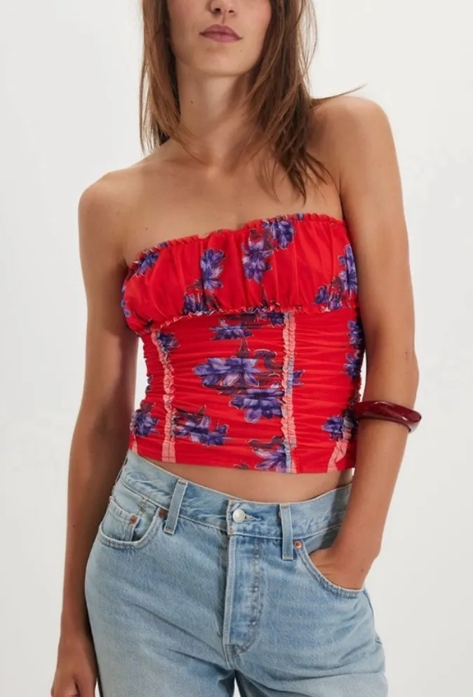 Chico's crop top with vibrant red and purple floral design. Strapless and stylish for any occasion.... Show more