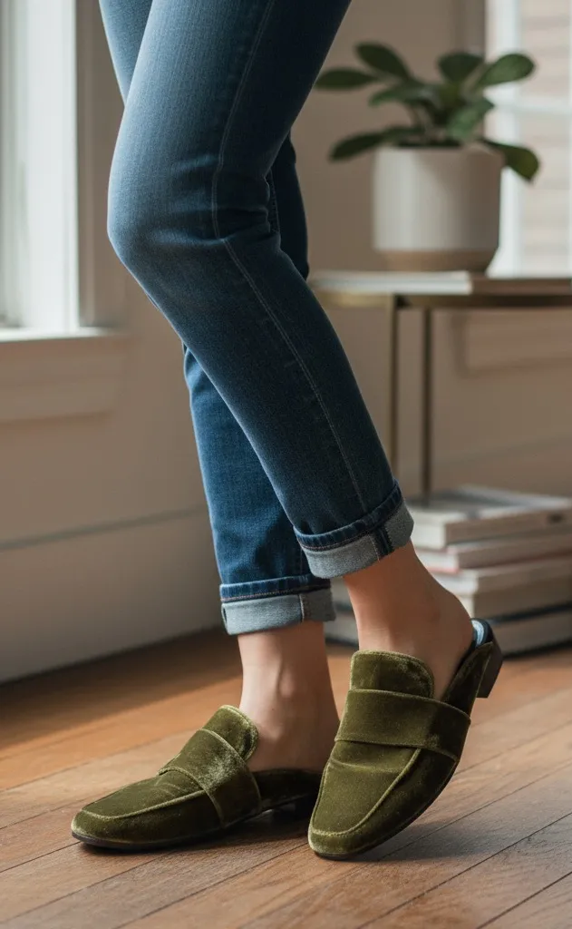 Excellent condition Women’s, ladies, shoes, slides, slip on, velvet, green, boho, bohemian, classi... Show more