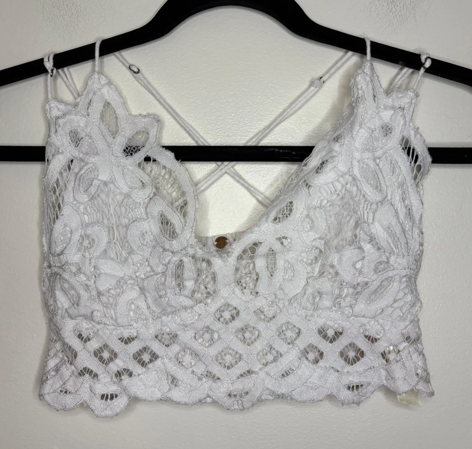A white lace bralette crop top. This delicate piece showcases intricate crochet detailing throughout... Show more