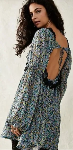 Free People Pennie babydoll dress in black with small floral print. Ruffled lace along bodice and ba... Show more